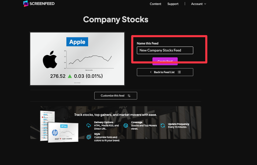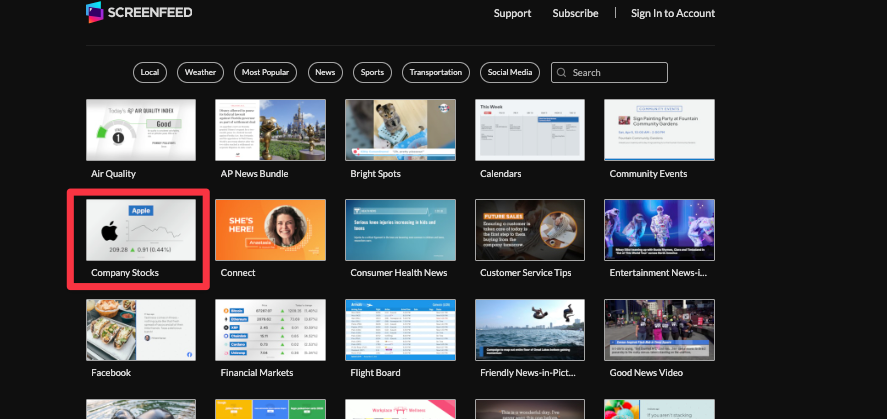 Step by step instructions on how to configure a Company Stocks feed from Screenfeed showing stock market symbol data on your digital signage software.