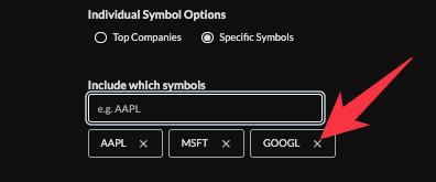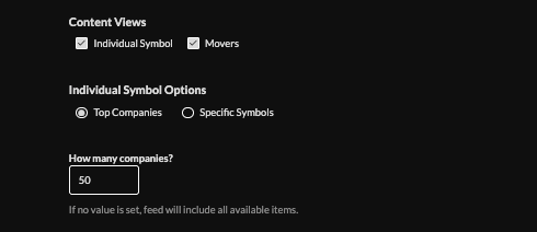 - Select content views to include, if "individual symbol" is selected, include top companies (default 50) or specify symbols by entering a business name/symbol.