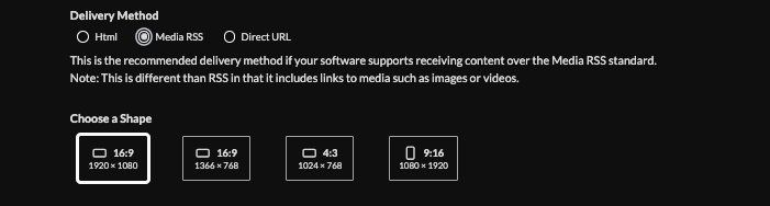 9. Choose a delivery method (HTML, media, direct URL) and click "Create Feed". Need help picking a delivery Method Learn more about advantages to each delivery method here www.screenfeed.com/support-articles/delivery-methods-available