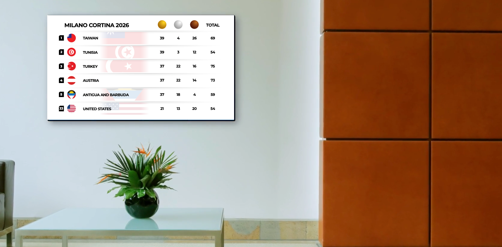 Medal count is a view available within Screenfeed's Sports Central feed. This view displays up to date medal counts for Winter or Summer games, covering 90+ countries.