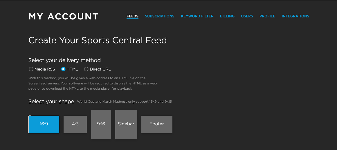 3. Scroll the subscription list to find your Sports Central subscription and click create a feed.