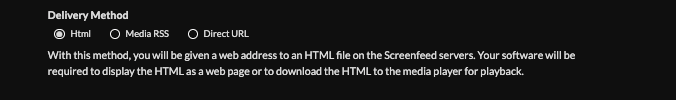 12. Select the delivery method (HTML Media RSS, direct URL).Learn more about advantages to each delivery method here www.screenfeed.com/support-articles/delivery-methods-available