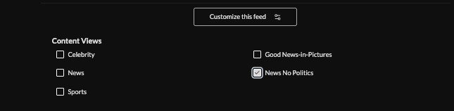 3. Click "Customize This Feed" and check content views to include (Celebrity, Sports, Good News in Pictures, News - No Politics). Stories from each content view selected will be included in the feed.