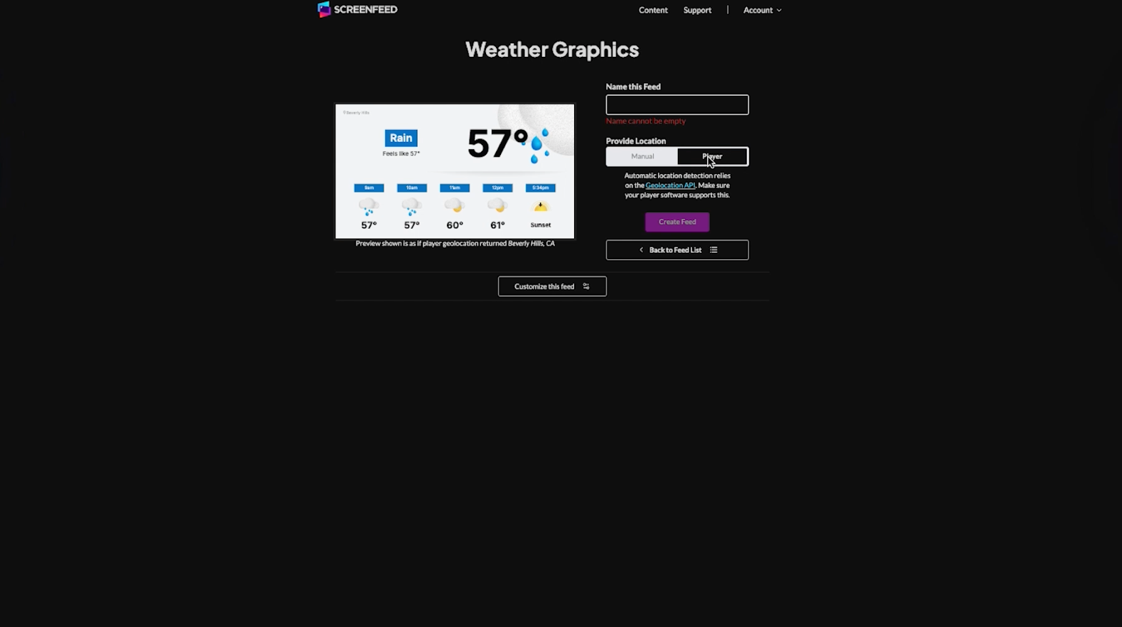 - Begin configuring a feed from the content menu that includes a location option.e.g. (Weather Graphics)
