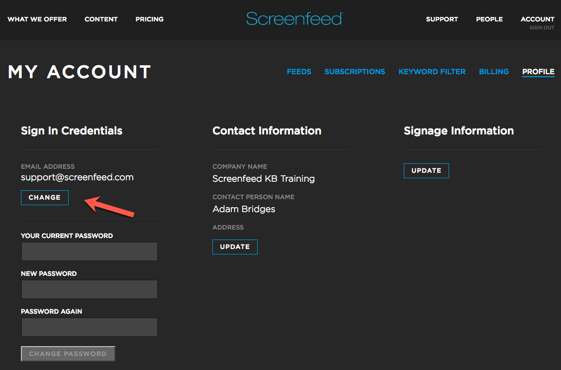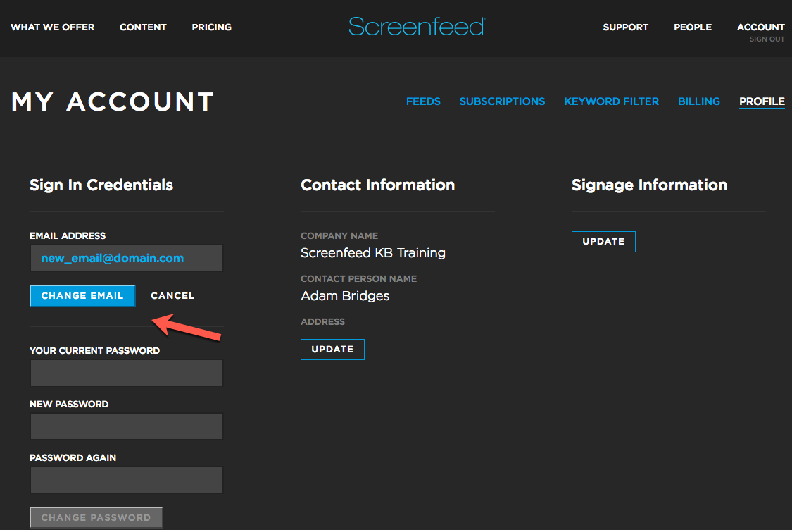 Once under the account Profile section, proceed to change the associated email address with the login. Simply click Change to update the email address.