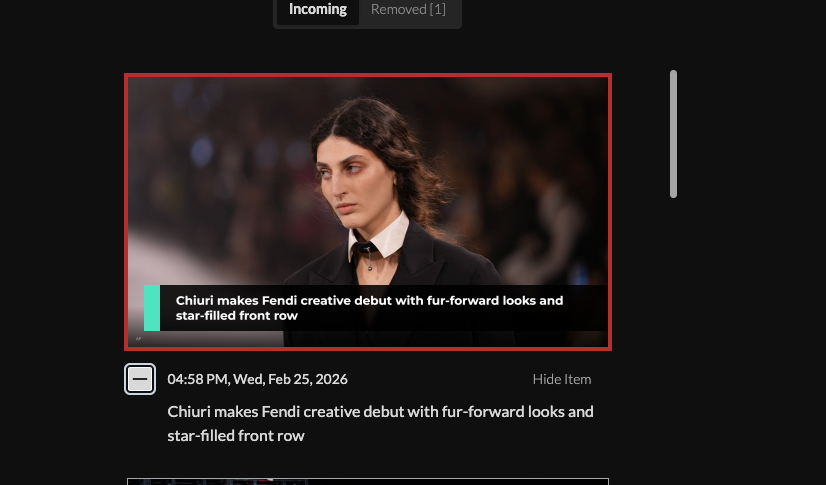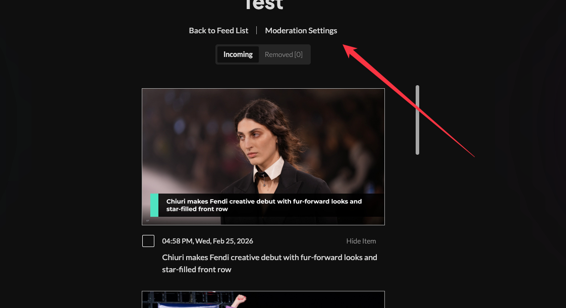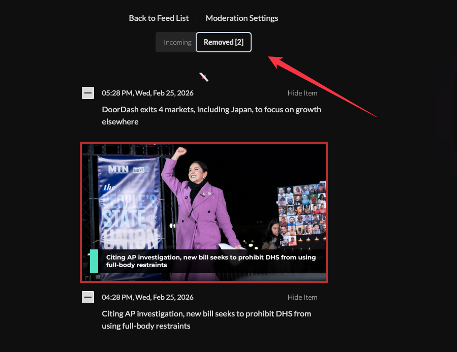 Review a list of all approved or removed content items at the top by toggling the view from incoming to Removed (or Approved)