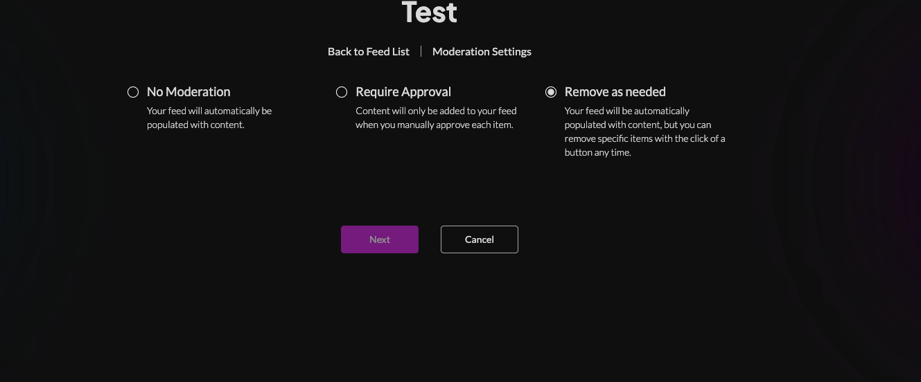 Require Approval - No content will be delivered into the feed until it has been reviewed and approved by you. Note: With this option your feed will not update until you return to approve more content. Additionally, content will not expire after Screenfeed's suggested expiration date, they will remain in the feed until you remove them.