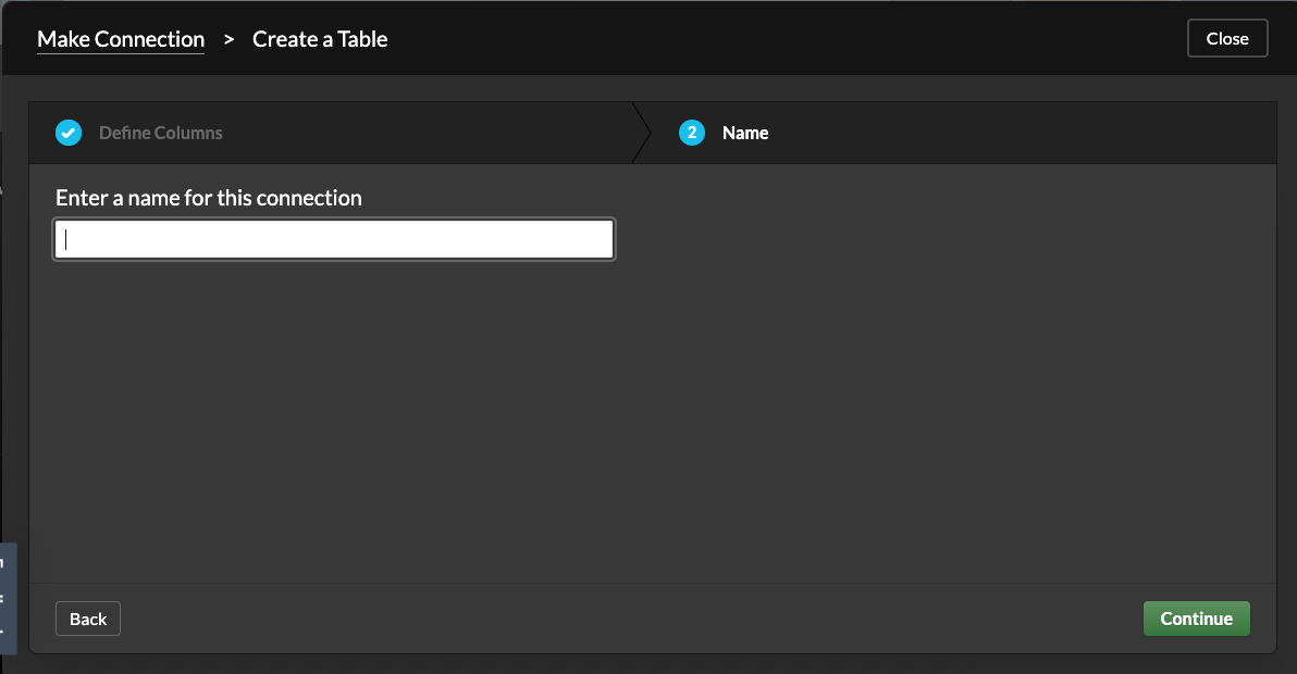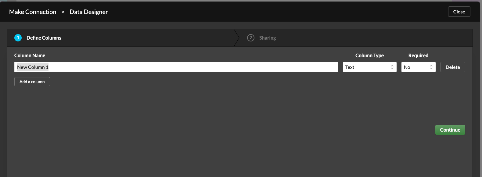 Next choose the name for columns, add columns the data type of the column and whether or not it is a required field. Then click Continue.