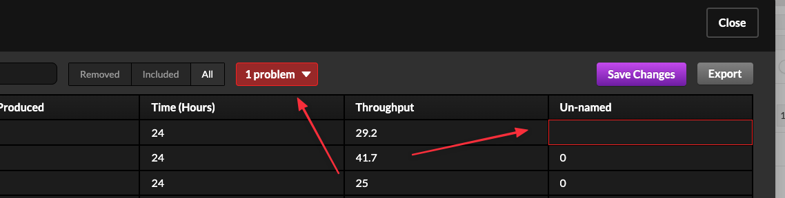 If there are any problems with the table you will see the number of problems in the top of the table and an outline of the problem cell on the table in red.