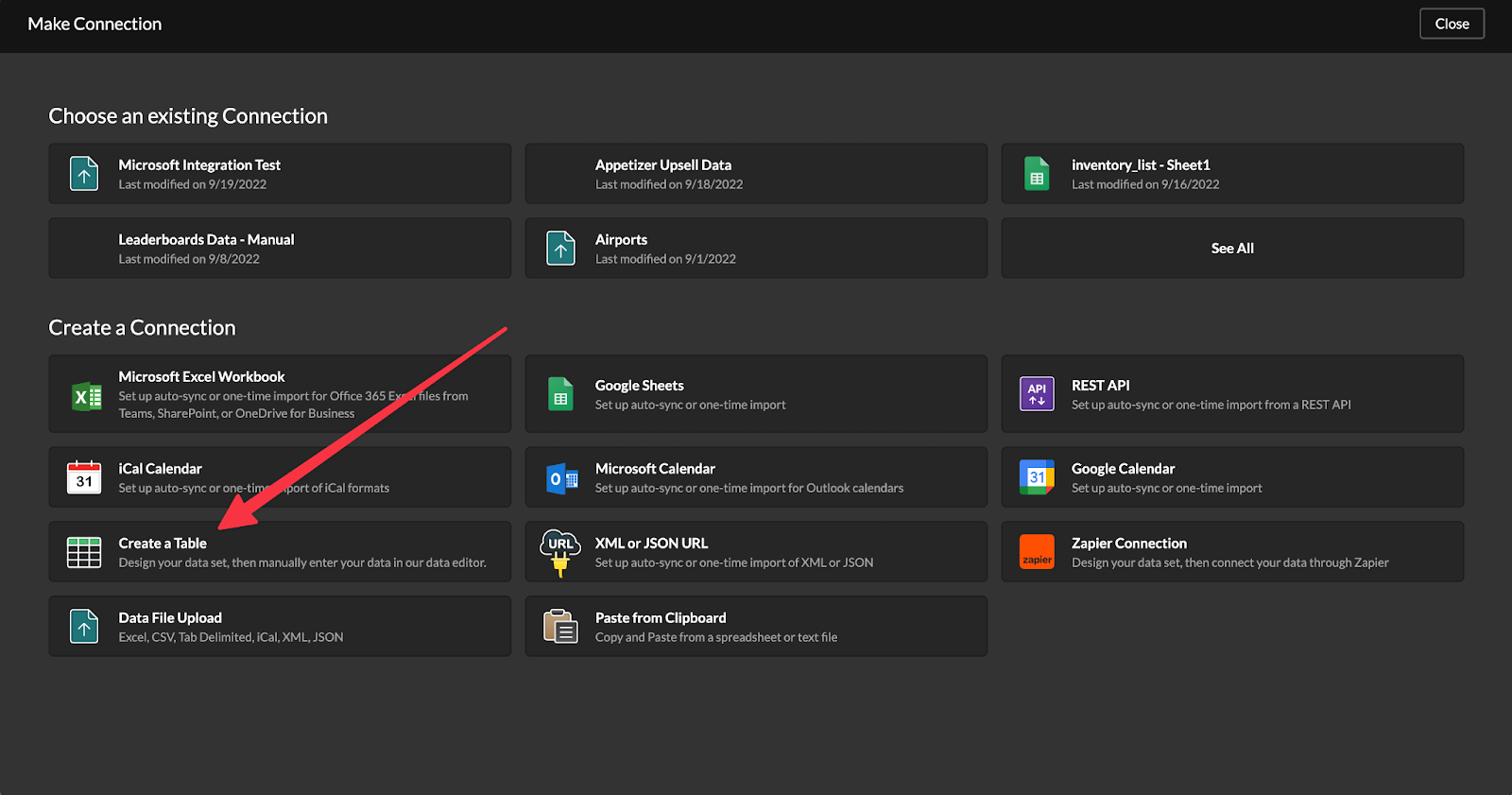 Click on Create a Table to create a new manual table connection, if you already have the data in a delimited format you can instead choose paste from clipboard and Connect will do some of the work for you.