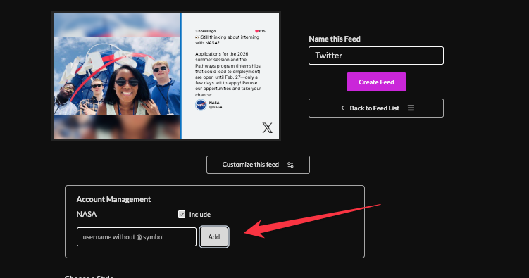 4. Enter in a twitter username/handle and click add to add to your feed. Up to three can be added to one feed. Depending on the handle it may take several hours before posts are pulled in to the feed.